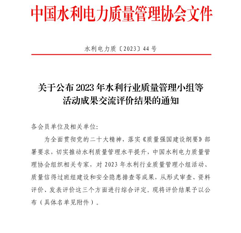 公司2023年度水利行業(yè)質(zhì)量管理小組榮獲一等成果